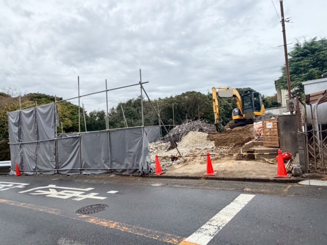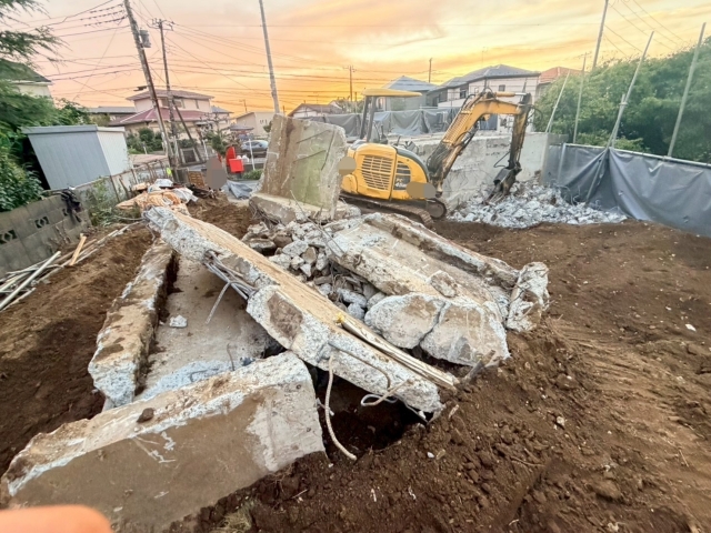 | 工事内容 | シート養生・躯体解体工事(重機)・スレートみなし処分・地下車庫解体工事・基礎撤去工事・土間撤去処分・樹木撤去処分・アスベスト事前調査 |