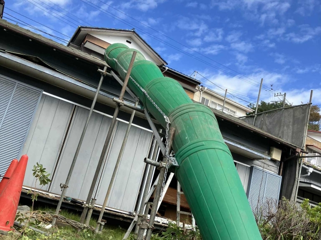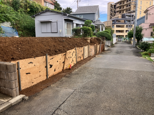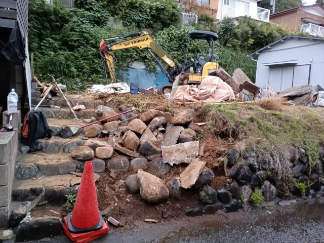 | 工事内容 | 養生工事・躯体解体工事・基礎撤去工事・土間撤去処分・コンクリートブロック塀撤去処分・樹木下草撤去処分・石積み階段・擁壁撤去処分・屋根スレート除去処分・検体採取石綿含有分析調査・水道管試掘工事 |