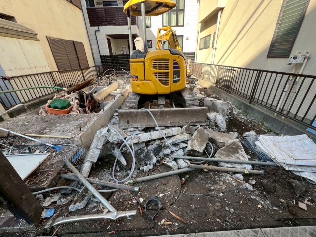 | 工事内容 | シート養生・躯体解体工事(重機)・基礎撤去工事・土間撤去処分・CB撤去処分・アスベスト事前調査 |