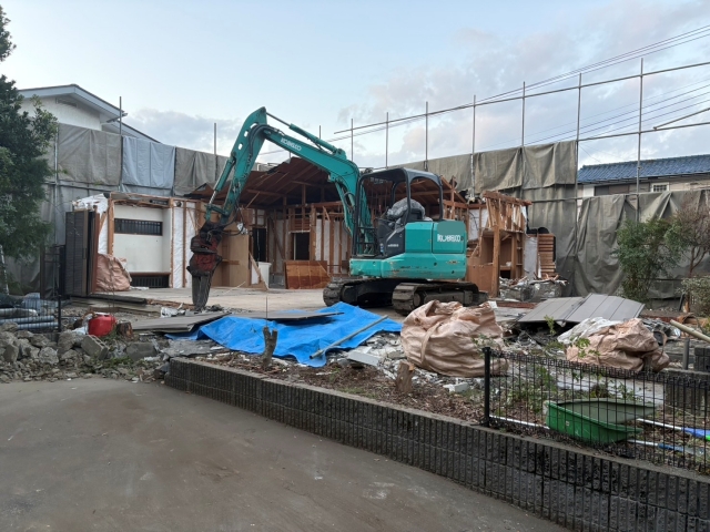 | 工事内容 | シート養生・躯体解体工事(重機)・基礎撤去工事・土間撤去処分・CB撤去処分・樹木撤去処分・庭石撤去処分・アスベスト検体調査 |