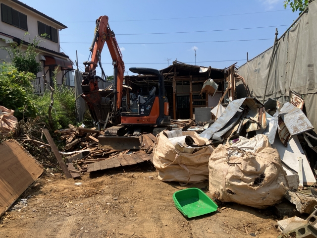 | 工事内容 | シート養生・躯体解体工事・基礎撤去工事・土間撤去処分・樹木撤去処分・作業所撤去処分 |