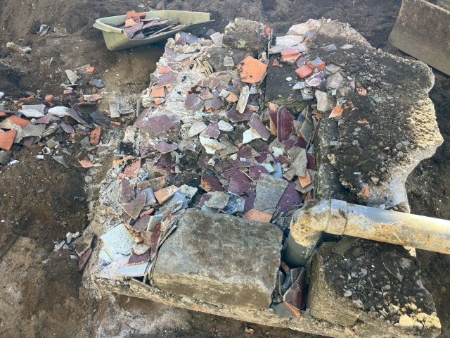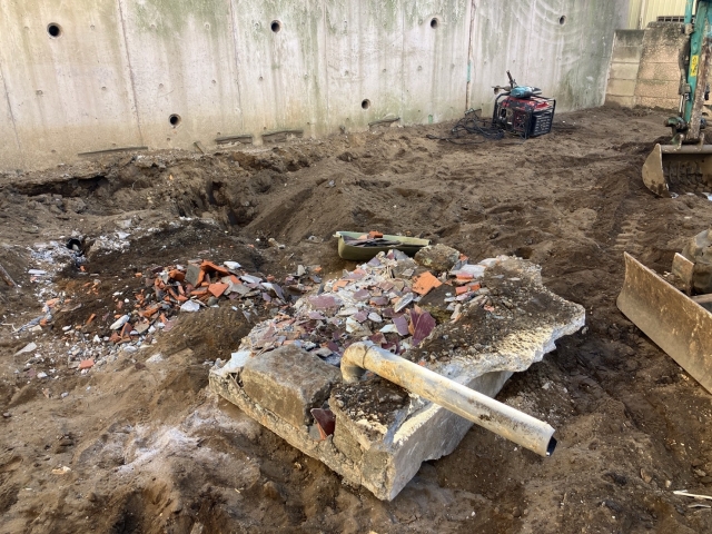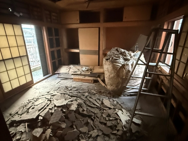 | 工事内容 | 養生工事・躯体解体工事・基礎撤去工事・土間撤去処分・塗装付Cブロック塀撤去処分・樹木下草撤去処分・庭石他撤去処分・バルコニー他撤去処分・屋根スレート除去処分・軒天ケイカル板除去処分・検体採取石綿含有分析調査・室内石綿含有材除去処分・プラシキ敷設・地中埋設物撤去処分 |