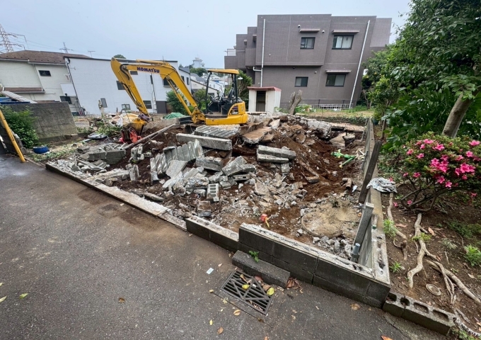 工事内容シート養生・躯体解体工事(重機)・基礎撤去工事・土間撤去処分・CB撤去処分・樹木撤去処分・庭石撤去処分・物置撤去処分・アスベスト検体調査・残置処分・樹木撤去処分