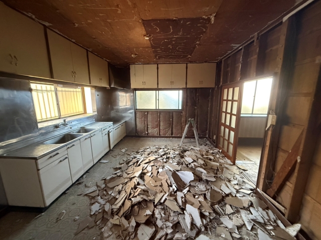 | 工事内容 | シート養生・躯体解体工事(重機)・基礎撤去工事・土間撤去処分・門扉撤去処分・樹木撤去処分・竹林撤去処分・敷石撤去処分・庭石撤去処分・小屋解体工事・アスベスト分析・残置物回収 |