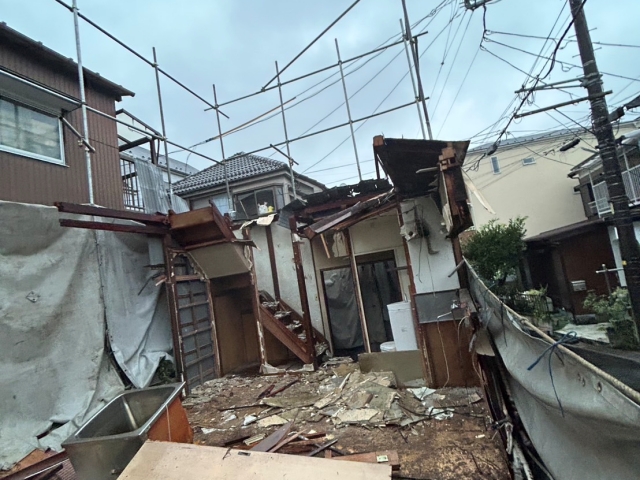 | 工事内容 | シート養生・躯体解体工事・基礎撤去工事・土間撤去処分・樹木撤去処分・アスベスト事前調査 |
