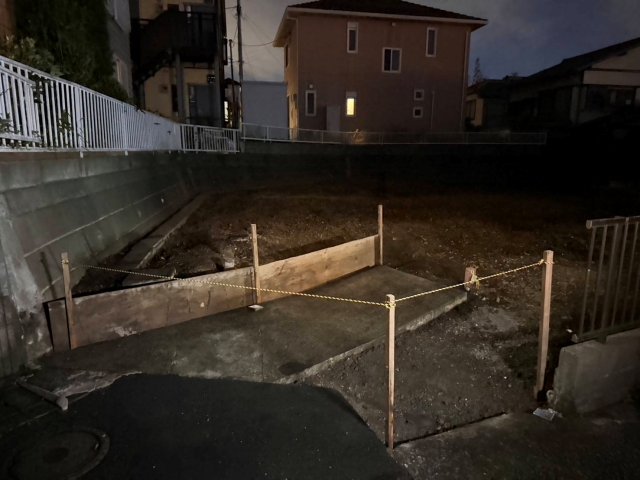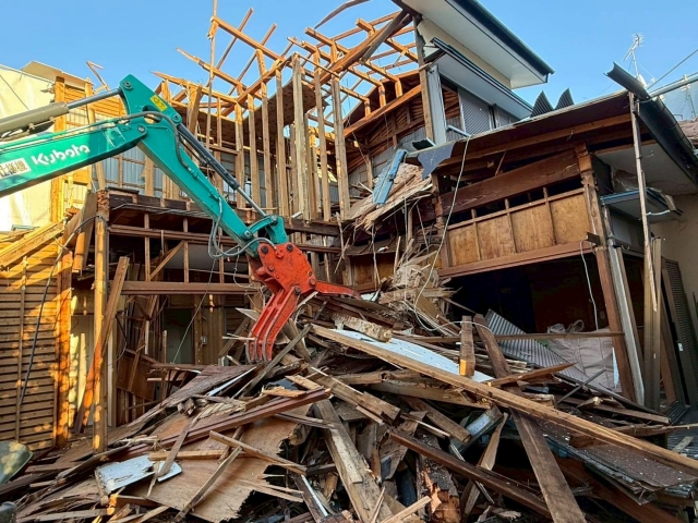 | 工事内容 | シート養生・躯体解体工事(重機)・基礎撤去工事・土間撤去処分・化粧CB撤去処分・樹木撤去処分・アスベスト分析・残置物撤去処分 |