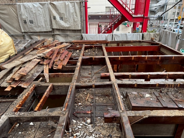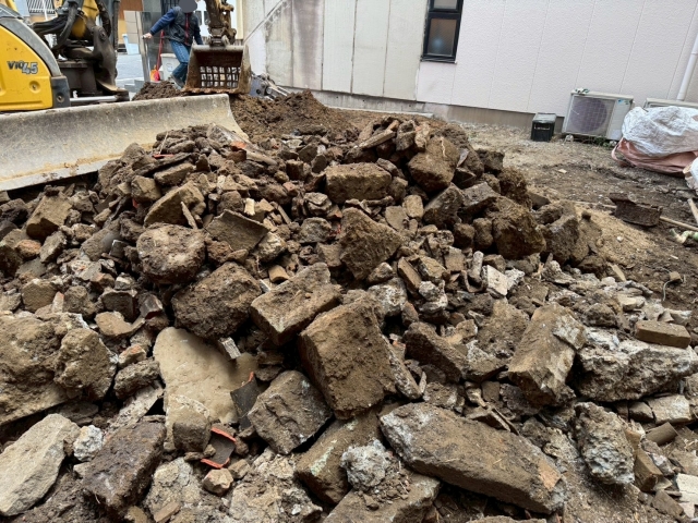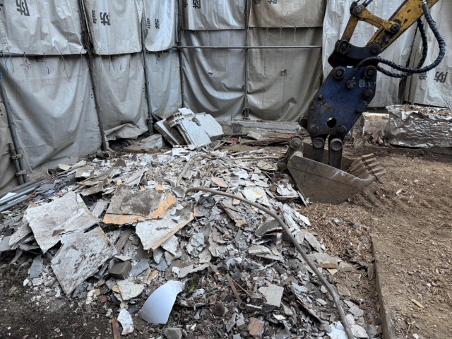 | 工事内容 | シート養生・躯体解体工事・基礎撤去工事・土間撤去処分・CB撤去処分・アスベスト検体検査・交通誘導員 |