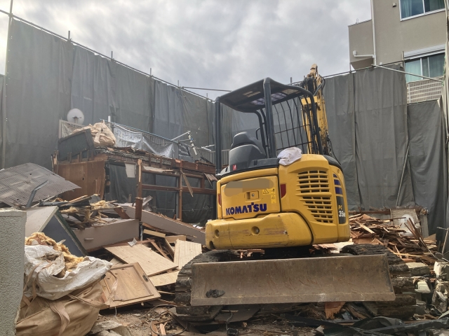 | 工事内容 | シート養生・躯体解体工事・基礎撤去工事・土間撤去処分・CB撤去処分・樹木撤去処分・庭石撤去処分・小運搬・アスベスト事前調査・埋設物撤去工事 |