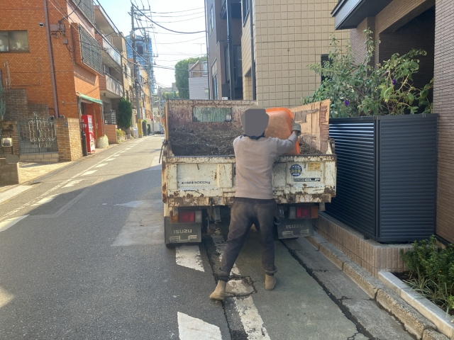 小運搬用の袋を用いて残土を手運びで搬出致しました。
