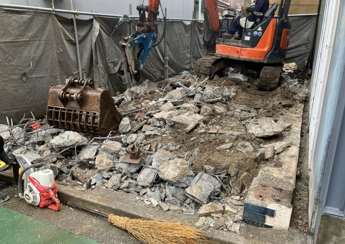 工事内容 | シート養生・躯体解体工事・基礎撤去工事・仮設工事・養生作業・石綿除去作業・特別管理産業廃棄物運搬処分・CB造内壁解体 |